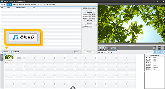 接下来准备一首富有节奏感的音乐。来到“音频”选项卡,点击左下角的“添加音频”导入背景音乐。