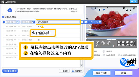 在“AI识别字幕”对话框,点击“保存并应用”按钮,回到爱剪辑主界面后,在“字幕特效”面板右下角“所有字幕特效”栏目,鼠标左键选中要修改文本内容的AI字幕,此时主界面右上角视频预览框会自动定位到该AI字幕,且字幕会处于带方框的可编辑状态,鼠标双击编辑框,在弹出的“编辑文本”对话框,修改该AI字幕的文本内容即可。