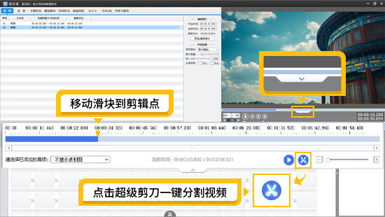 细节调整:在粗剪的基础上,对每个镜头进行仔细推敲,调整镜头顺序、时长和节奏。爱剪辑支持精准逐帧踩点,帮助你快速剪辑需要的画面。在右上角预览框的时间进度条上,点击向下箭头(快捷键Ctrl+E),软件会自动弹出创新式时间轴,鼠标定位到要分割的画面附近,使用“上下左右方向键”,逐帧选取剪辑点,点击主界面底部超级剪刀(快捷键Ctrl+Q),一键分割视频。按照此方法,可将视频分割成多段。