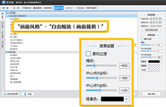 操作方法:我们先给视频应用“画面风格”-“自由缩放(画面裁剪)”功能,“效果设置”栏目的参数如图所示,即可将视频缩放在左侧。