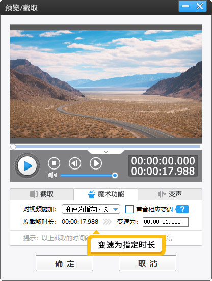 在“魔术功能”栏目,选择“变速为指定时长”,输入你指定的时长,软件会自动变速视频,以便让视频适应这个时长。比如:1小时的视频,我想变成10分钟,那在“变速为”时间栏,输入10分钟即可。软件会自动快进视频,让1小时的视频变成10分钟。