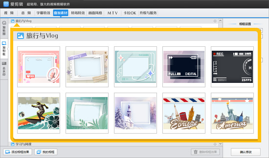 对于喜欢制作Vlog的用户来说,爱剪辑提供了多种时尚边框,如摄像机相框、胶片相框、复古电视机相框等。这些边框都可以在“加相框”列表的“旅行与Vlog”栏目中找到。此外,如果你想要打造杂志风格的Vlog,或者CP甜蜜风格、浪漫可爱风格、健康运动风格等,爱剪辑都能提供相应的边框素材。