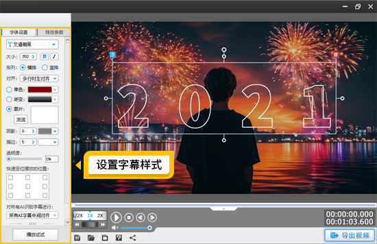 点击“字幕特效”,双击预览框,添加年份“2021”,可在数字间加空格,以营造倒计时效果。设置字体大小为300,并选择合适的描边颜色。为了增加视觉效果,可以导入一张透明的PNG图片作为镂空字幕的底纹。