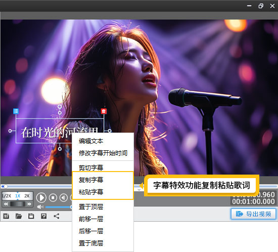 随后,我们将目光聚焦于“字幕特效”区域,然后,双击视频预览框,将从网上搜集到的歌词内容复制粘贴进来。对于综艺类音乐视频,追求歌词颜色与大小的丰富变化以营造层次感。因此,对于不同的歌词,我们分别添加并赋予其各异的字体颜色与大小,同时在左侧仔细勾选相应的歌词特效。