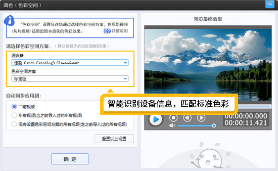打开爱剪辑,把灰片视频拖曳进去。软件会自动弹出“调色”对话框,在这里可以看到拍摄器材和对应的标准颜色,右侧就能看到视频从灰片还原为真实色彩的效果。若想实现更多电影调色方案,在“色彩空间方案”下拉框中选择和调整即可。