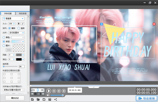 接下来,点击顶部的“字幕特效”面板,然后直接双击视频预览框,这时你就可以尽情抒发对爱豆的喜爱与支持,将饱含深情的应援文案以文字形式巧妙融入视频,让每一句应援都能精准传达你的心意。不妨尝试中英文结合,自由搭配文字的大小、颜色,让字幕错落有致地分布在视频中,为视频营造出丰富的层次感,也让粉丝的心意更直观地传达出来。