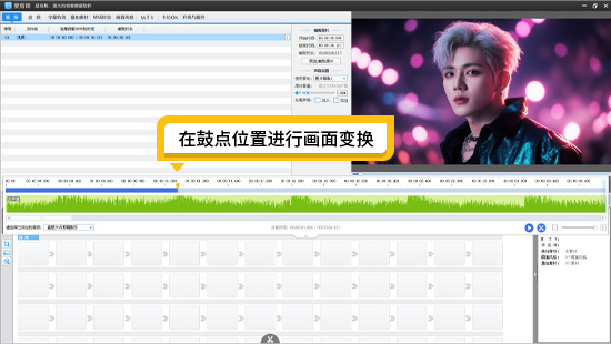添加音乐后,我们可以导入更多爱豆不同角度、不同场景的视频。按Ctrl+E打开创新式时间轴,移动滑块到音乐的鼓点处,也就是波峰或波谷的位置,对画面进行切换、变色或变速操作。让爱豆的每一个精彩瞬间都能精准地跟随音乐节奏,卡点视频效果会让观众沉浸其中,忍不住反复观看。