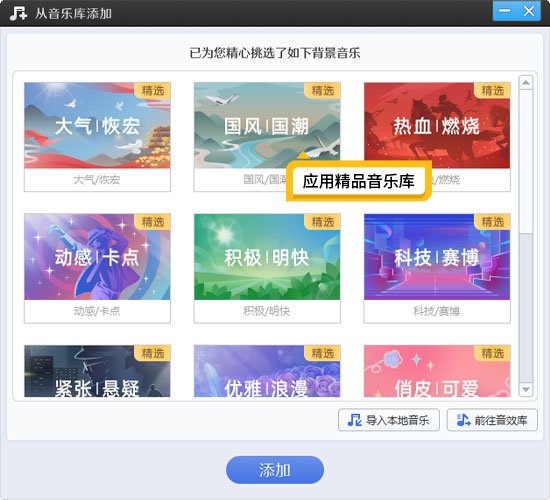爱剪辑的精品音乐库素材丰富,能帮你快速找到心仪的音乐类型,进而从中挑选优质又好听的背景音乐。这些音乐作曲精良,氛围感强,与视频搭配默契,还能避免与网络上泛滥的音乐素材雷同,让你的作品独具个性与高级感。