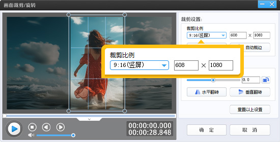 接下来,在软件界面的左下角,找到并点击“画面旋转/裁剪”功能,进入画面调整的操作界面。选择裁剪比例为9:16,这是竖屏视频的标准比例。通过裁剪,视频画面能够完美适配竖屏尺寸,黑边也会随之消失。裁剪完成后,返回到主界面,你会惊喜地发现视频已经变成了无黑边的竖屏满屏状态。
