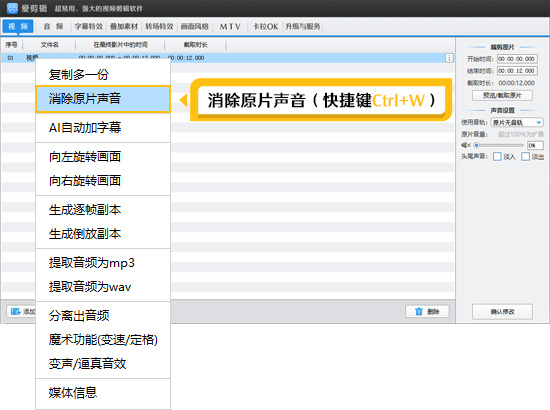 如果视频原音与你的解说内容冲突,你可以选择关闭视频原音。这可以通过调整视频音量为0或右击视频选择“消除原片声音”来实现。